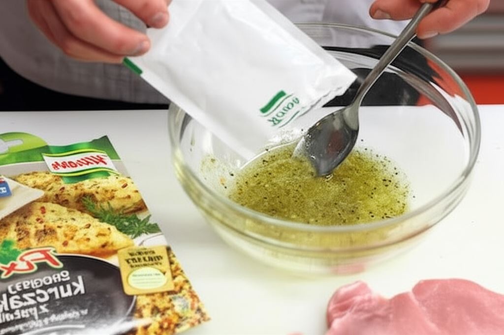 2. Sporządź marynatę, łącząc Przyprawę do kurczaka oraz Majeranek Knorr z oliwą i ketchupem. Mięso umieść w marynacie, pokrywając je starannie zarówno na zewnątrz, jak i wewnątrz.