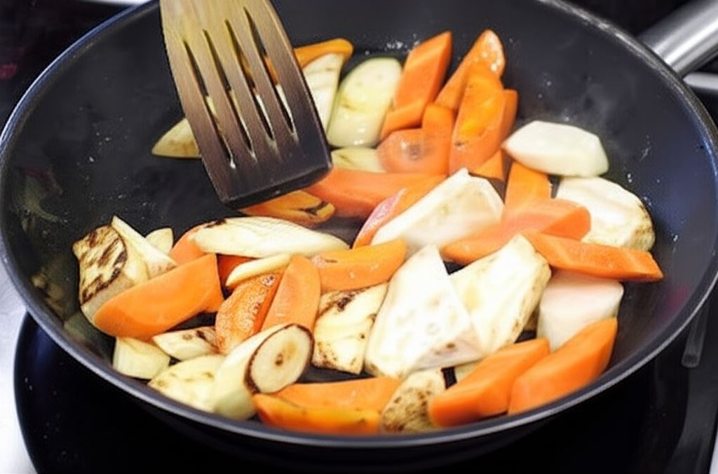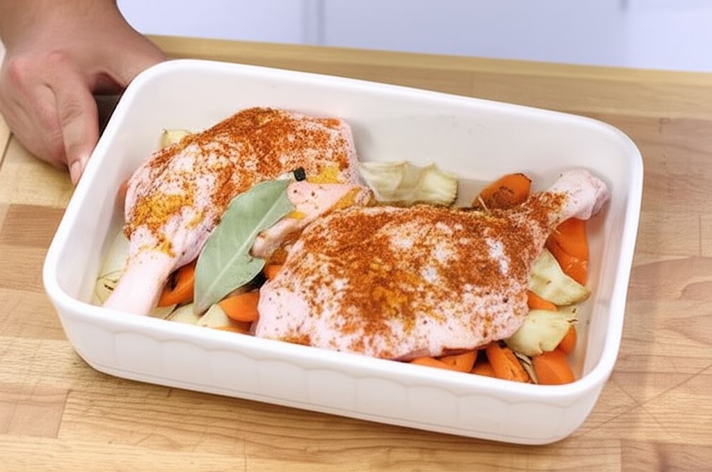 Włoszczyznę oczyść, obierz i posiekaj, zrumień, a potem przełóż do naczynia żaroodpornego. Na warzywach umieść udka kaczki.