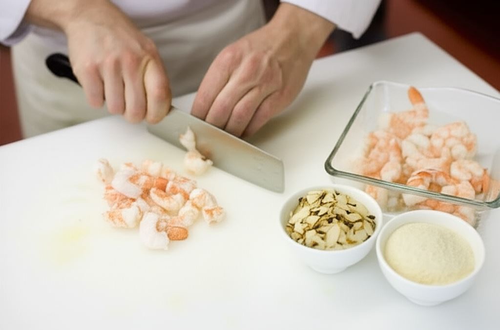 Krewetki posiekaj drobno. Ser zetrzyj na tarce. Migdały zrumień na suchej, gorącej patelni, rozdrobnij i połącz z bułką tartą oraz startym serem.