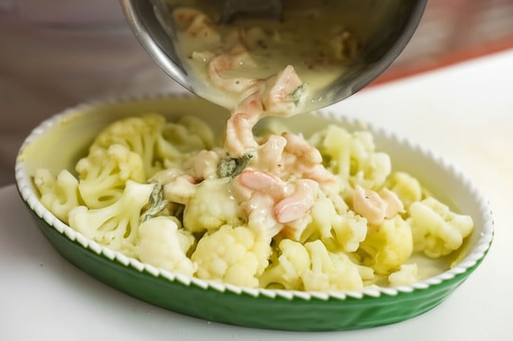 Kalafior w sosie śmietanowo-serowym z krewetkami