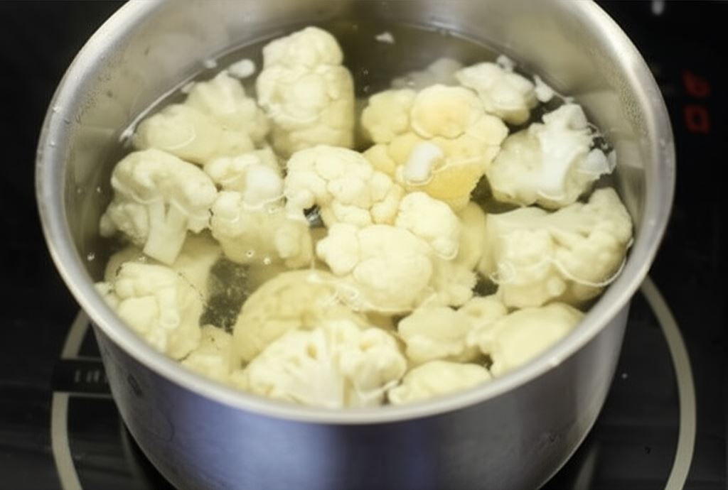 Kalafiora oczyść i podziel na mniejsze kawałki, po czym blanszuj krótko w osolonej, wrzącej wodzie.