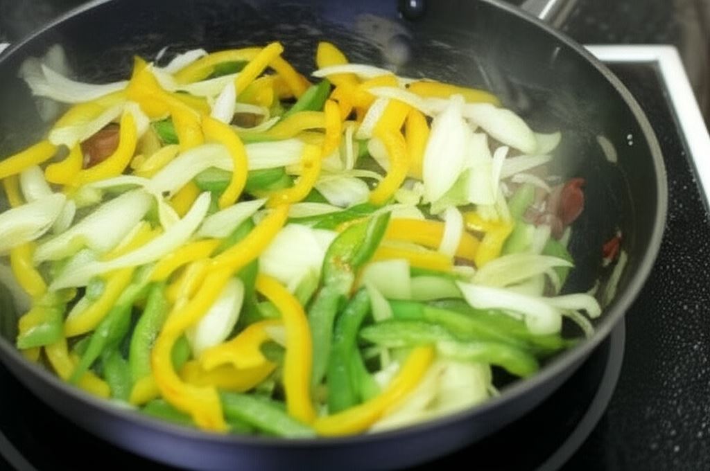 Szynkę potnij w paski, cebulę w piórka – zrumień razem na gorącej oliwie, wsyp paprykę, zamieszaj i odsuń z ognia.