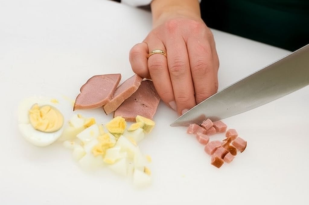 Szynkę oraz ugotowane jajka pokrój w kostkę. Ugotowany kalafior polej sosem i posyp jajkami i szynką. Serwuj z bagietką.
