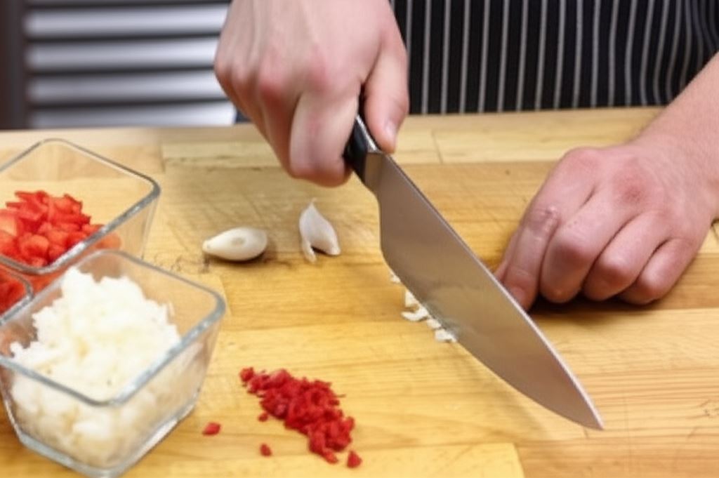Pomidory i czerwoną paprykę pokrój w kostkę, ostre chili i czosnek drobno posiekaj.