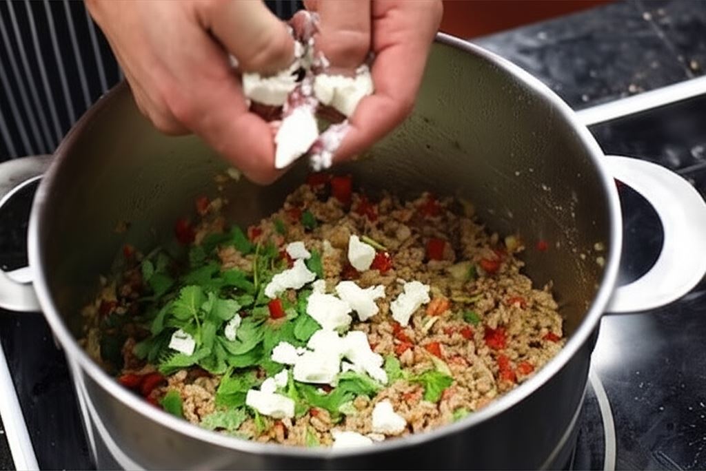 Wsyp posiekaną kolendrę i część pokruszonej fety. Zamieszaj.