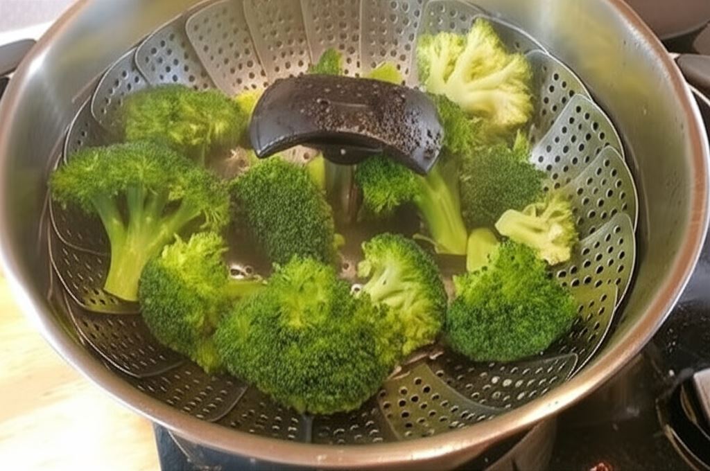 Brokuł rozdzielamy na różyczki (odcinamy łodygę), opłukujemy pod zimną wodą i gotujemy parowo. Dzięki temu brokuł utrzyma swój intensywny zielony kolor. Do gotowania parowego możemy wykorzystać specjalne sitko lub wkład do garnka, gotowanie brokułu potrwa około 10 minut.