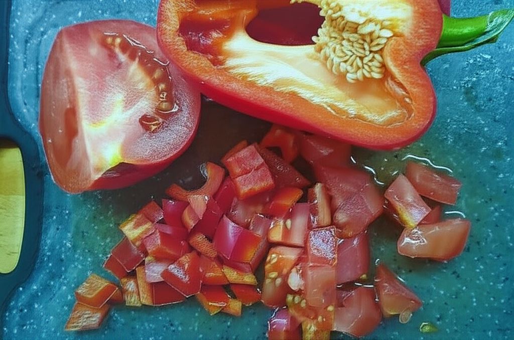Zmiksowaną masę przekładamy do miseczki. Przygotowujemy kawałki chleba żytniego, które obficie smarujemy pastą. Na górę każdej kromki nakładamy łyżeczkę majonezu. Kroimy w małą kosteczkę paprykę oraz pomidora i obsypujemy nimi kanapki.
