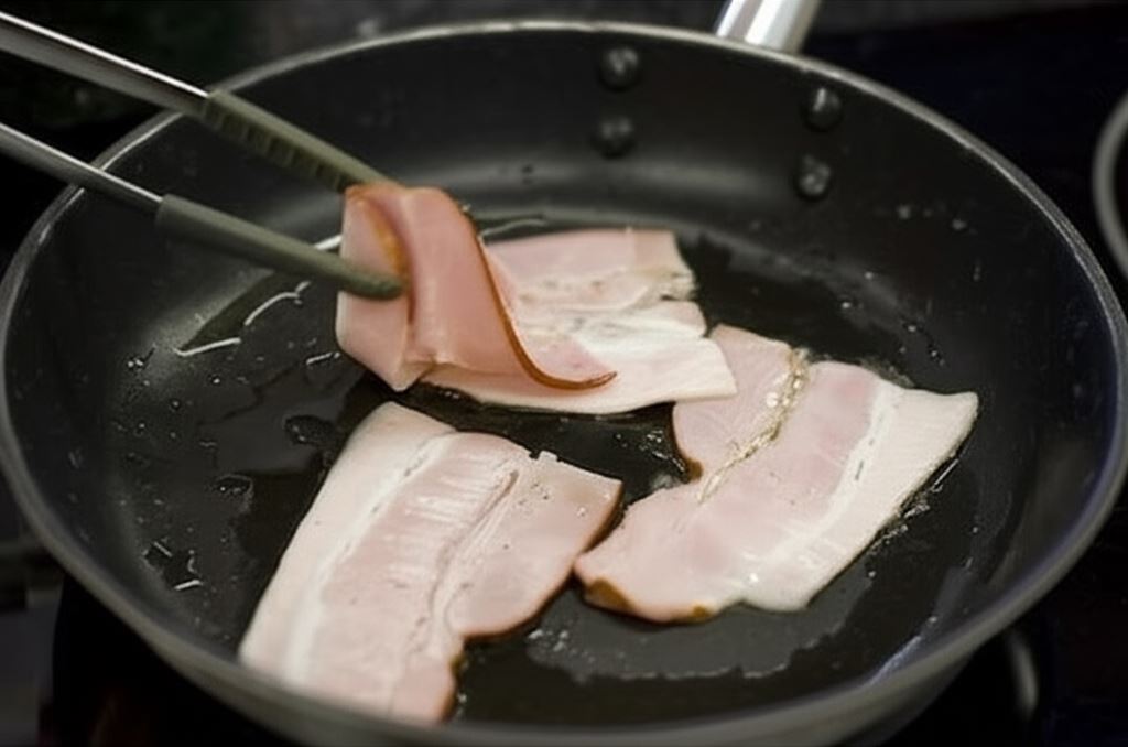 Przysmażaj boczek na patelni, aż będzie chrupki. Potem umieść go na kromkach i nakryj plastrem indyczej szynki.