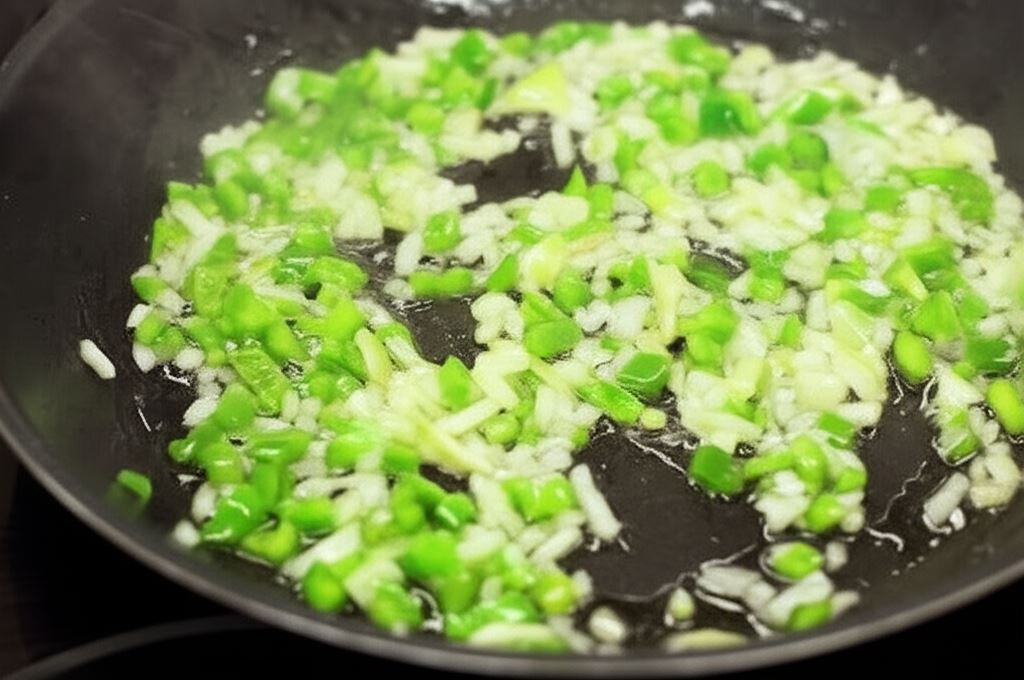 Na rozgrzaną oliwę dodaj cebulę, czosnek, paprykę i smaż aż do momentu, kiedy warzywa zmiękną.