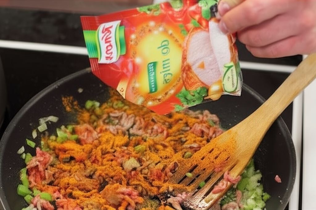 Teraz dodaj mięso, przypraw przyprawą Knorr i smaż cały czas, dopóki większość płynu nie odparuje.