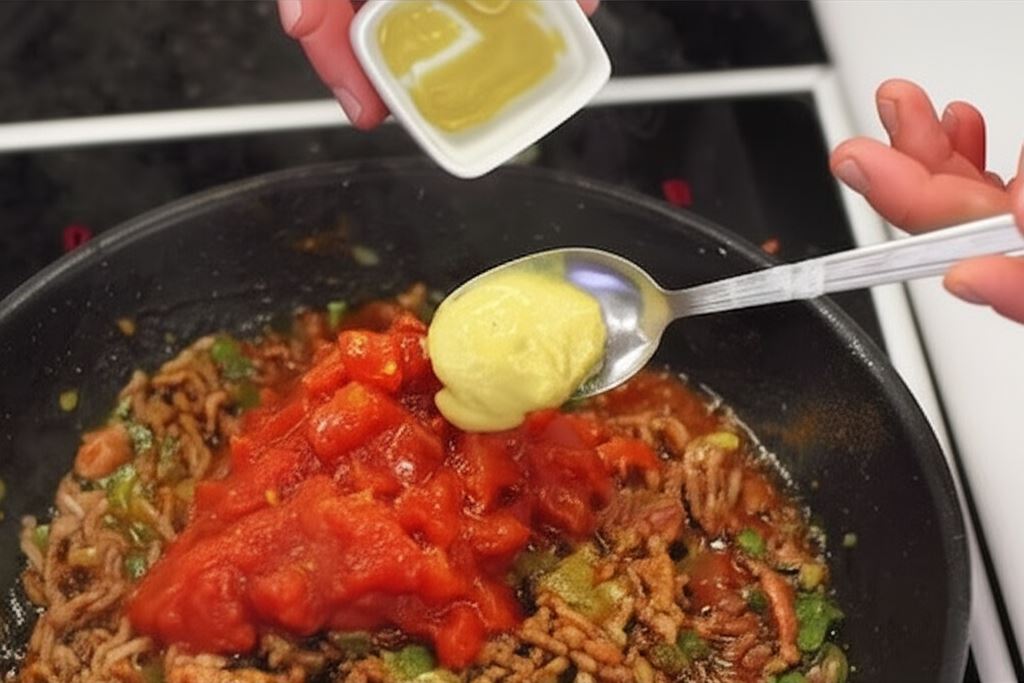 Dodaj pomidory, musztardę, ocet i cukier. Kontynuuj smażenie przez kolejne 10 minut.
