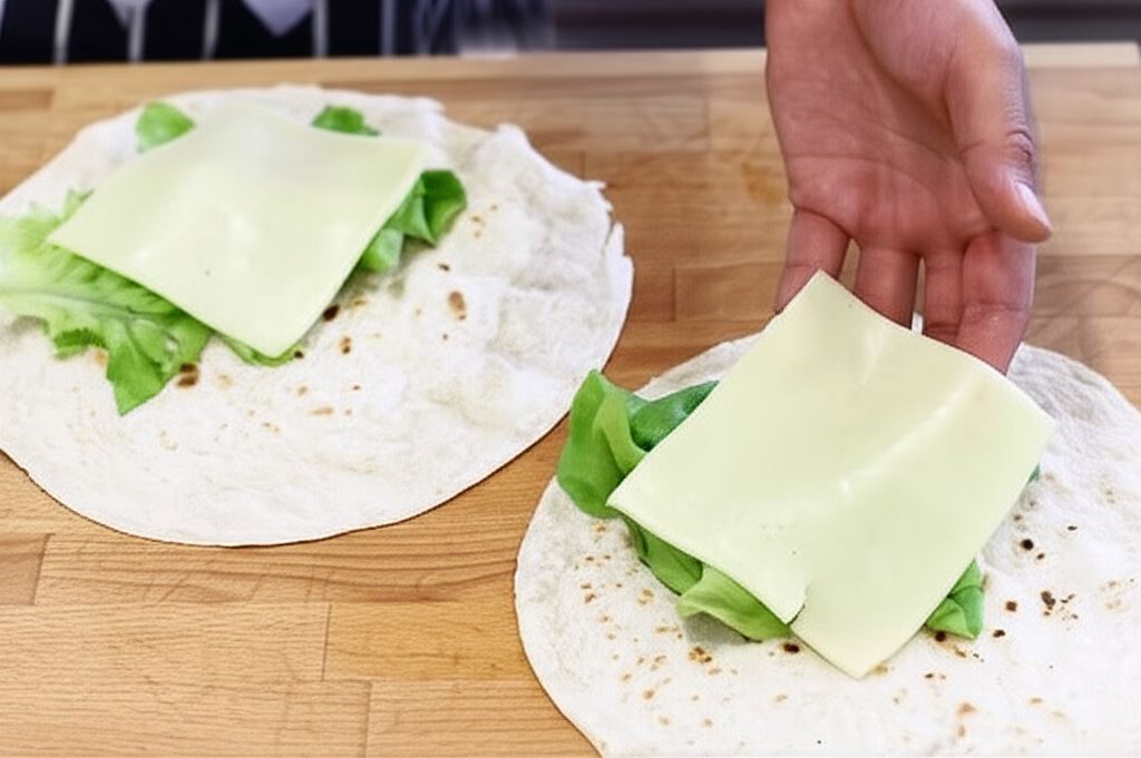 Podpiecz krótko placki tortilla na nagrzanej patelni i ostudź. Na każdy z nich nałóż sałatę i ser.