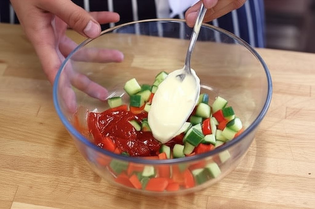 Paprykę, ogórka i pomidora pokrój w kostkę, umieść w miseczce. Majonez połącz z ketchupem i dodaj do warzyw, zamieszaj.