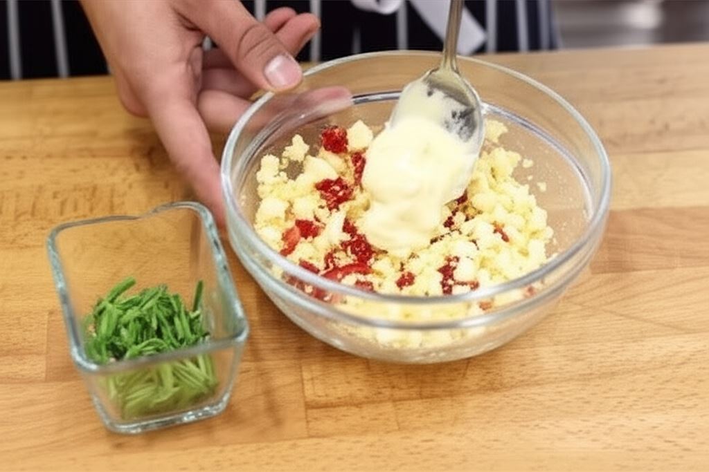 Rozgnieć ugotowane jajka widelcem w miseczce, wsyp pokrojoną paprykę, dodaj majonez i szczypiorek.