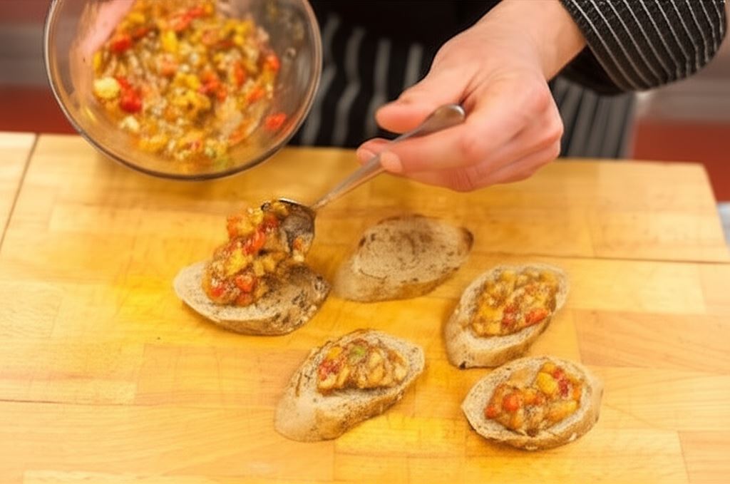 Przygotowaną pastę rozsmaruj na upieczonych uprzednio w piekarniku kawałkach bagietki.
