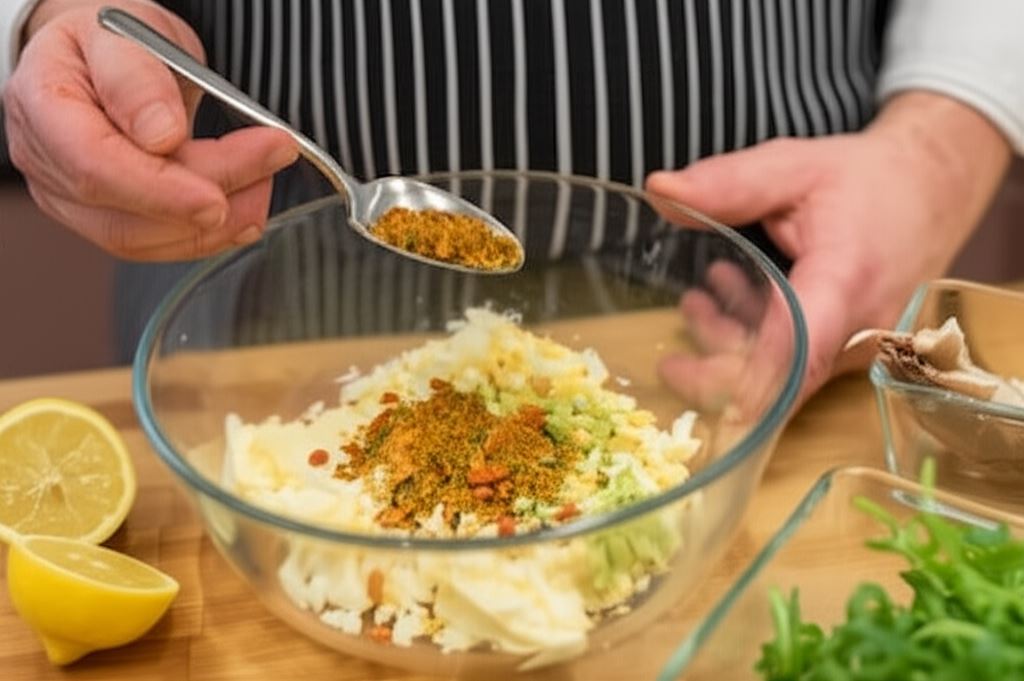 Jajka ugotuj na twardo i posiekaj w drobną kosteczkę. Awokado obierz, w miseczce rozgnieć na papkę. Obydwa składniki połącz z majonezem, dopraw do smaku mieszanką węgierską oraz sokiem z jednej cytryny.