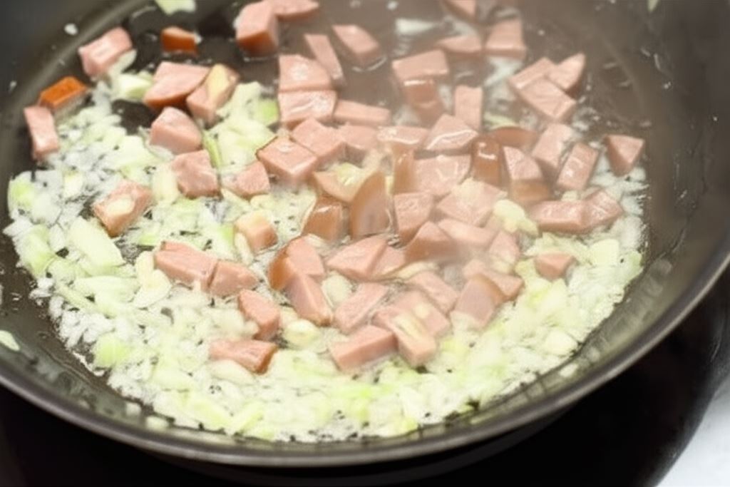Cebulę, czosnek i kiełbasę pokrój na drobne kawałki i zrumień na patelni z dodatkiem oleju.