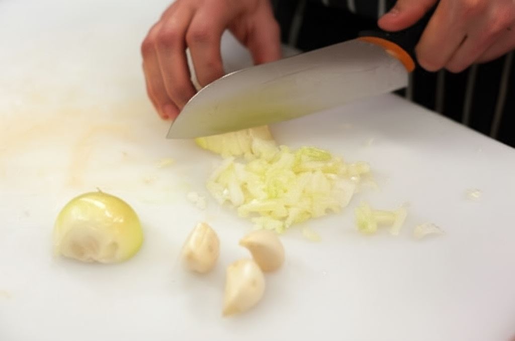 Kapustę poszatkuj drobno. Czosnek posiekaj, a cebulę pokrój w małą kostkę.