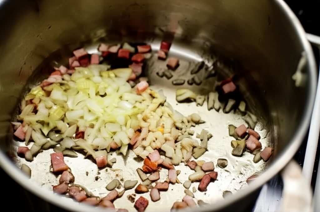 W sporym garnku zrumień pokrojony w kostkę boczek oraz cebulę i czosnek.