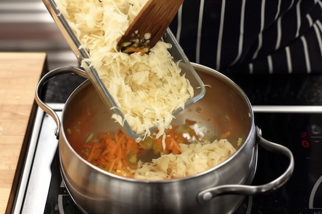 W odpowiednim garnku na oleju rzepakowym zeszklij posiekany czosnek, pokrojoną w kostkę cebulę i startą marchewkę, dorzuć poszatkowaną i opłukaną w wodzie kiszoną kapustę. Całość razem smaż przez moment.