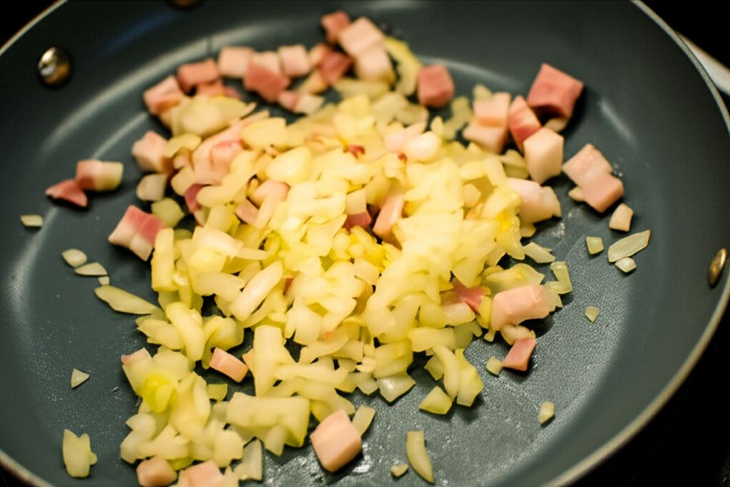 Przyrumień pokrojoną w kostkę słoninę i cebulę.