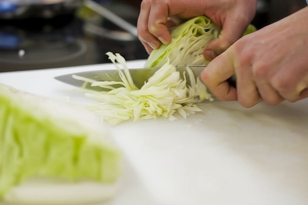 Kapustę przetnij na połowę, usuń głąb, obie części drobno poszatkuj.