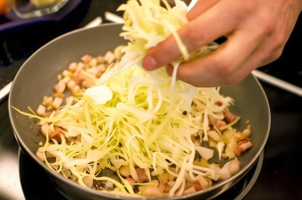 Kiedy boczek i cebula się zrumienią, dodawaj kapustę stopniowo i obsmażaj ją.
