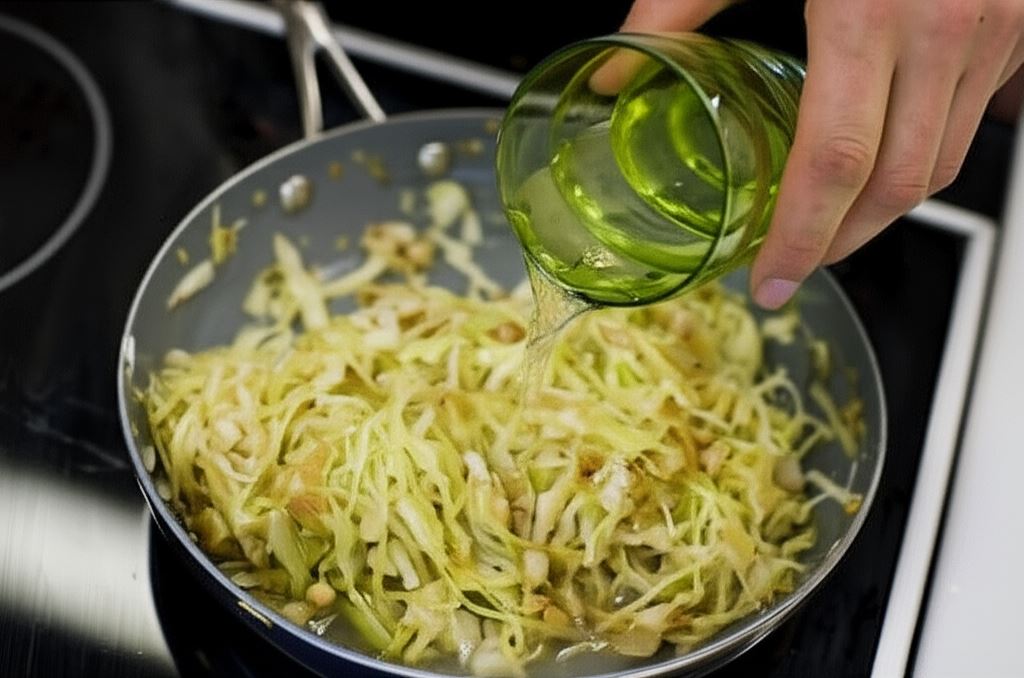 Kiedy cała kapusta znajdzie się na patelni, wlej jedną szklankę wody i dodaj kilka szczypt czarnego pieprzu. Duś przez 15-25 minut, w zależności od wieku kapusty – powinna być miękka.