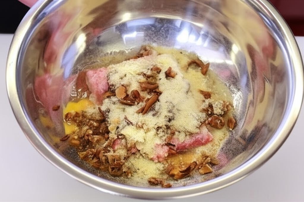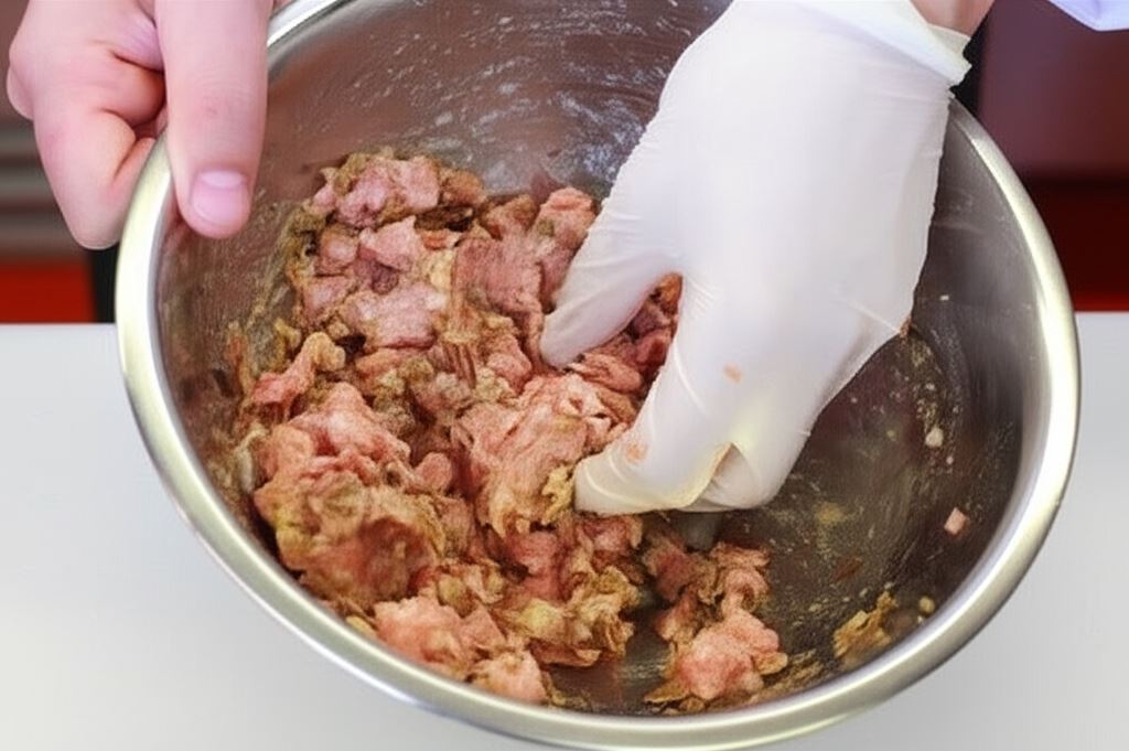 Połącz mięso z jajem, posiekanym czosnkiem i 1 łyżką bułki tartej. Przypraw do smaku pieprzem i szczyptą soli, potem dodaj grzyby.