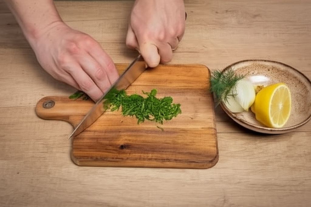 Cebulę posiekaj w piórka, z cytryny zetrzyj skórkę i wyciśnij sok, drobno posiekaj koper i natkę pietruszki, rozgnieć ząbki czosnku z niewielką ilością soli.