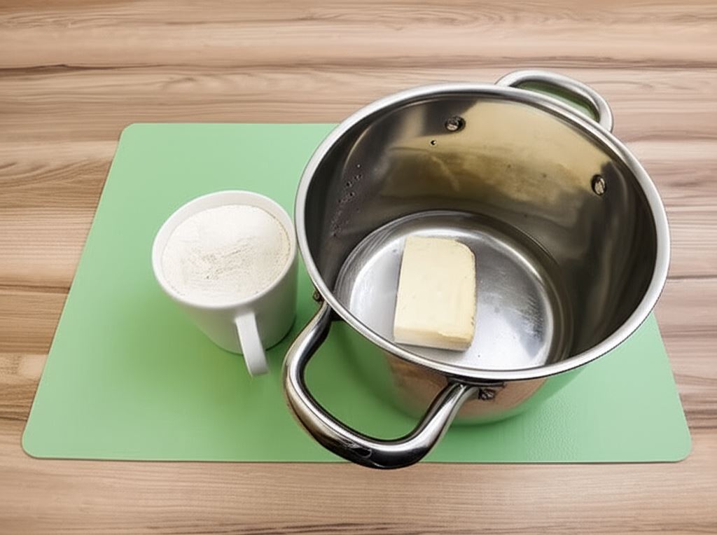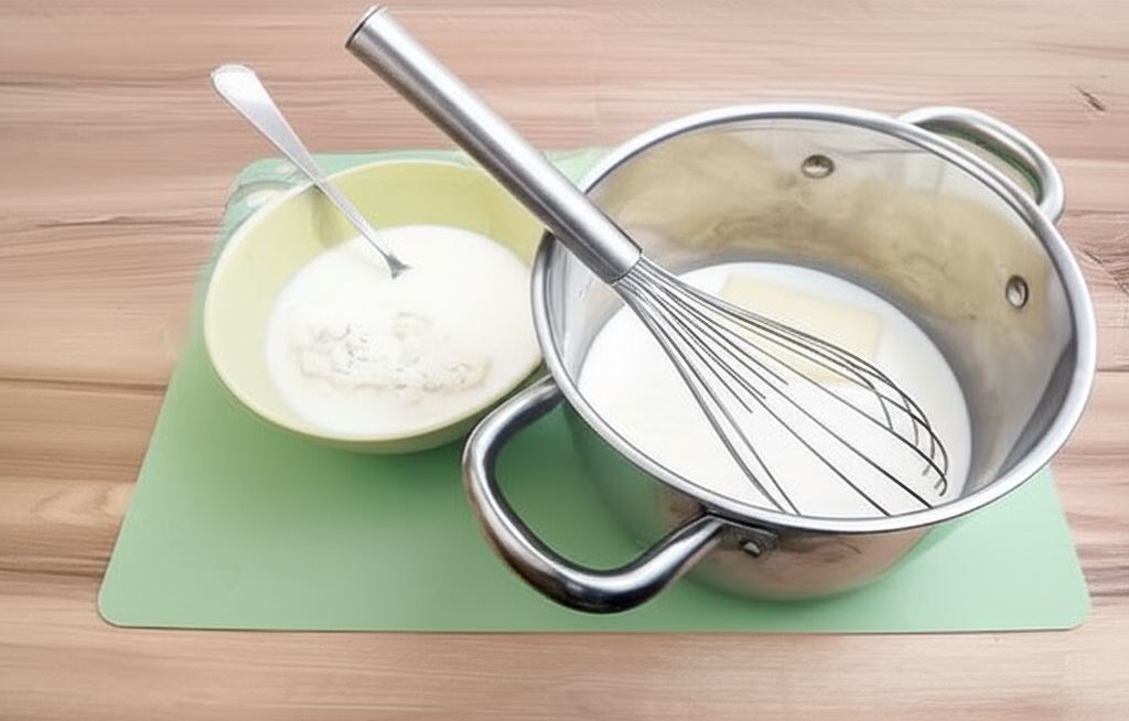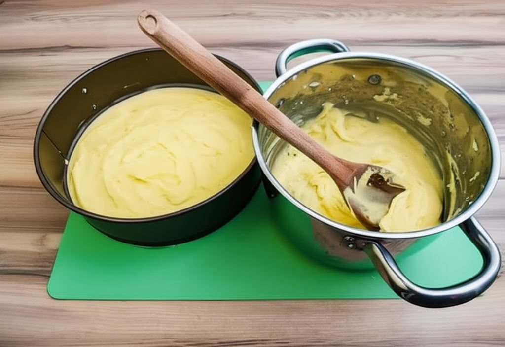 W rondlu umieścić 0,5 l mleka, masło i cukier. W kubeczku wymieszać 200 ml mleka z mąką pszenną i ziemniaczaną. Do wrzącego mleka z masłem i cukrem wlać mleko dokładnie połączone z mąkami i energicznie mieszać aż całość zgęstnieje. Odstawić do ostygnięcia pod przykryciem.