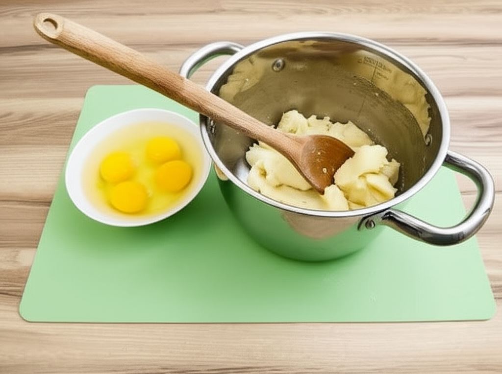 Doprowadzić wodę z masłem do wrzenia. Dodać mąkę i zamieszać aż powstanie jednolita masa. Pozostawić do ostygnięcia. Rozgrzać piekarnik do temperatury 200°C. Spód tortownicy o średnicy 24 cm wyścielić papierem do pieczenia.