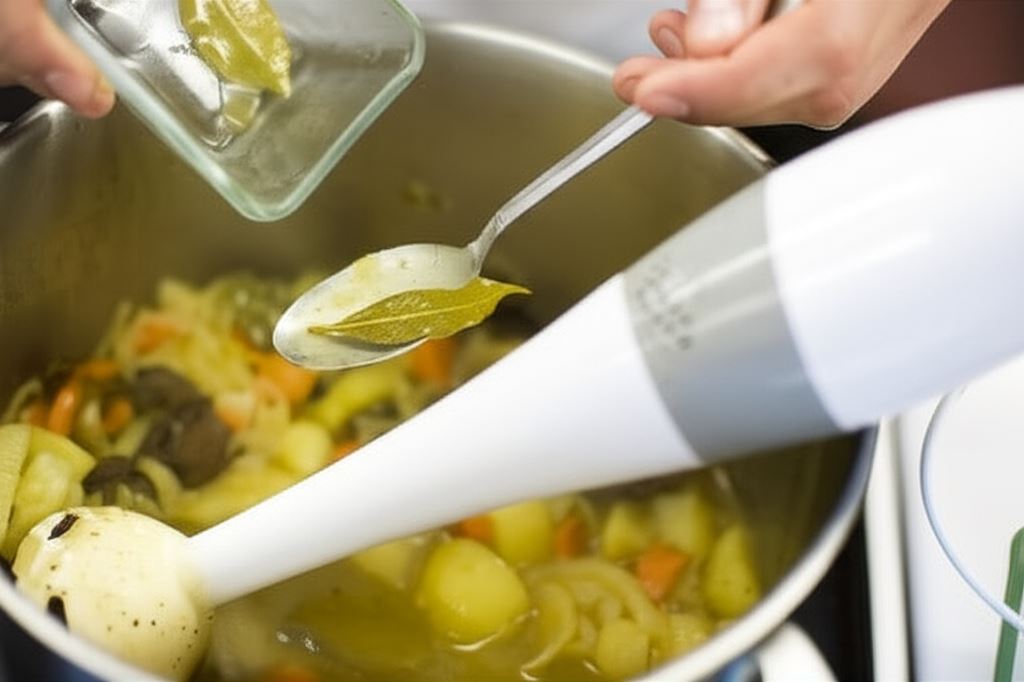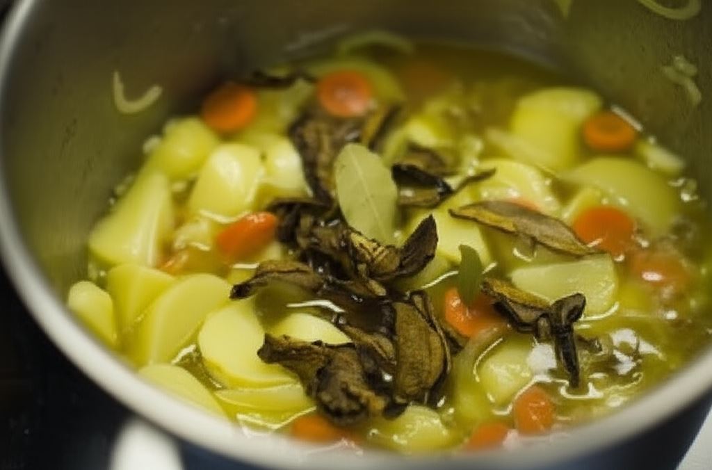 Kiedy cebula się zeszkli, zalej wszystko rosołem, wsyp grzybki i dodaj przyprawy.