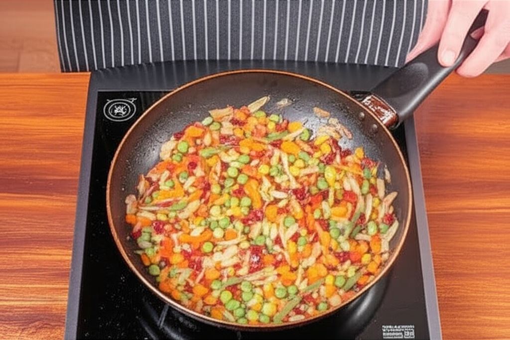 Oddzielnie rozgrzej olej (2 łyżki) i dodaj mrożonki, smażąc aż zmiękną.