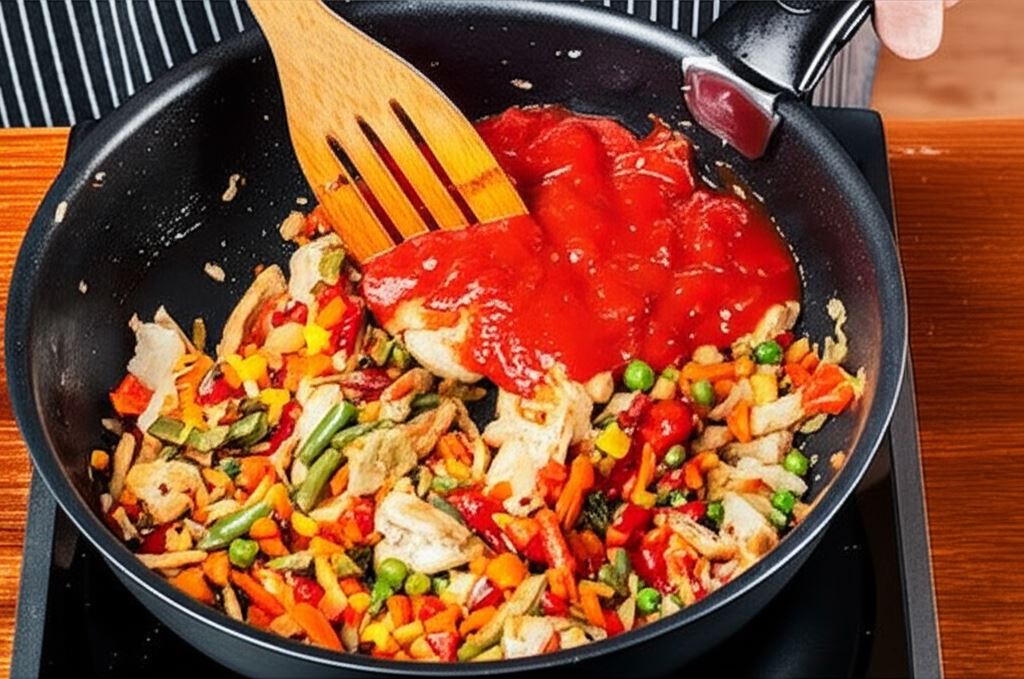 Na koniec wsyp kukurydze by tylko nieco się poddusiła. Warzywa przenieś do kurczaka i zamieszaj, a potem dodaj pokrojone pomidory i smaż cały czas mieszając.