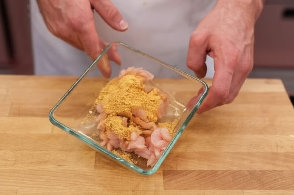 Pocięte filety kurczaka zamarynuj, posypując je hojnie Fixem Knorr. Mięso przysmaż na tłuszczu. Wystudź.