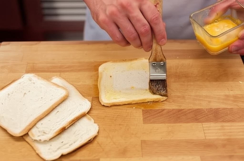 Plastry pieczywa umieść pomiędzy dwoma arkuszami pergaminu, po czym silnie dociskając, rozwałkuj je na płaskie placki. Brzegi chleba posmaruj roztrzepanym jajkiem.