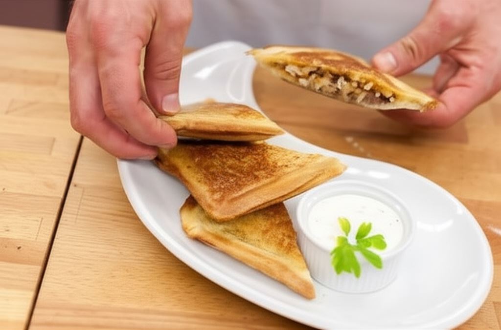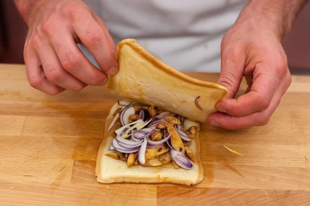 Sekret tkwi w przygotowaniu pieczywa – rozwałkowane kromki chleba tostowego tworzą idealną „kieszonkę” dla soczystego mięsa i chrupiącej cebuli. Całość dopełnia kremowy dip czosnkowy, który dodaje daniu wyrazistości i świeżości. To nie jest zwykły fast food – to domowe danie, które zachwyci każdego miłośnika dobrych smaków!