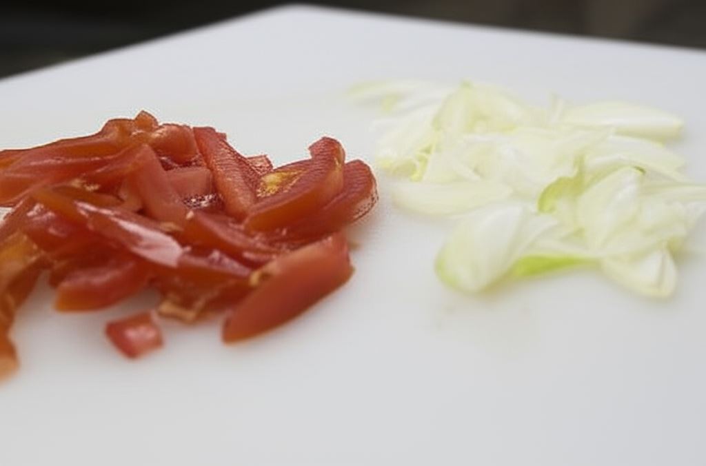 Pomidory oraz cebulę pokrój na bardzo cienkie paski.