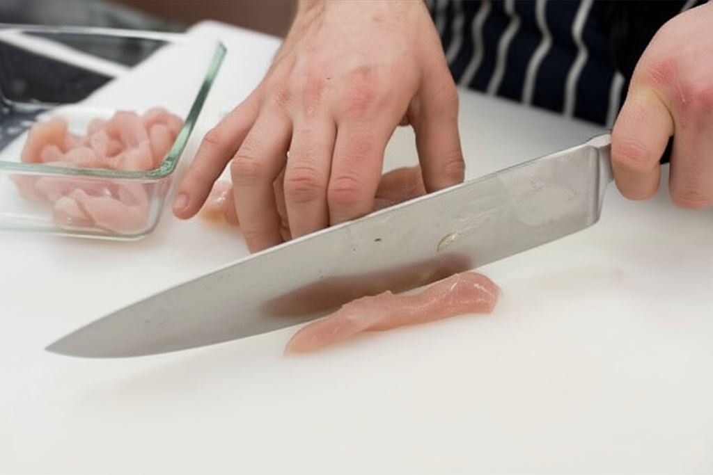 Filety z kurczaka potnij na małe paski.
