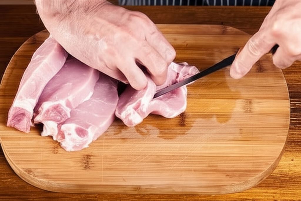 Potnij schab na plastry o grubości jednego centymetra. Wykonaj w każdym kawałku głębokie nacięcie z boku, formując kieszonkę.