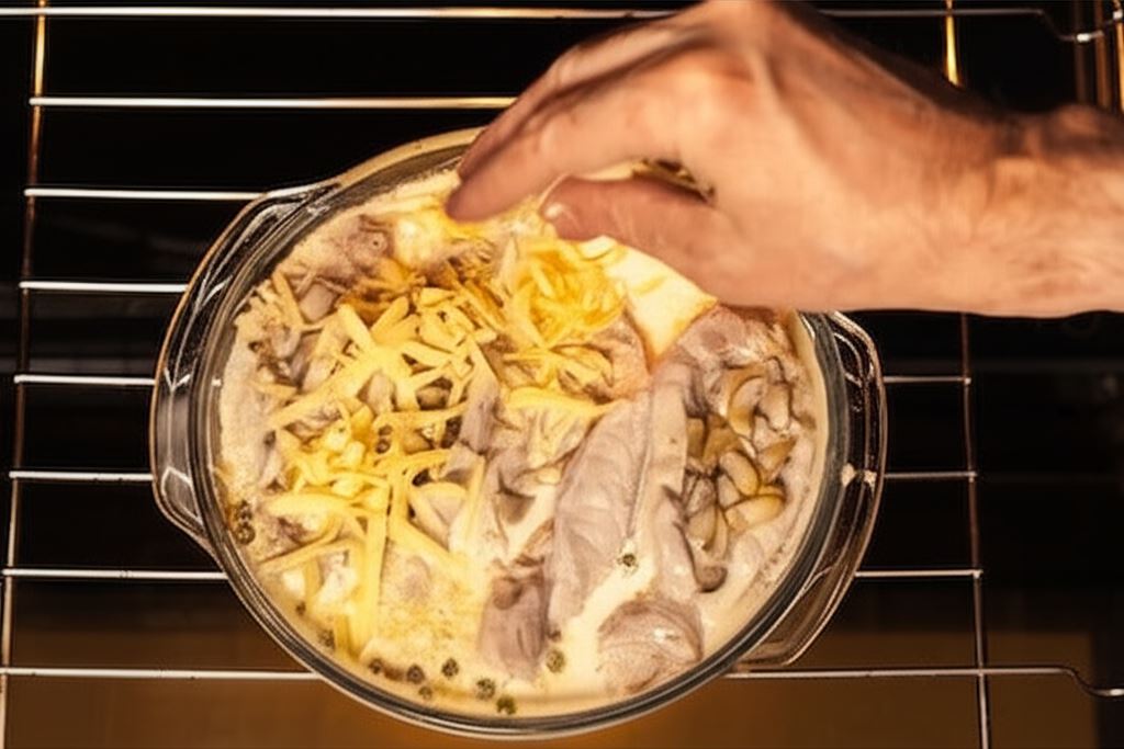 Potem usuń pokrywkę, obsyp tartym serem, zapiecz ser do złotego koloru.