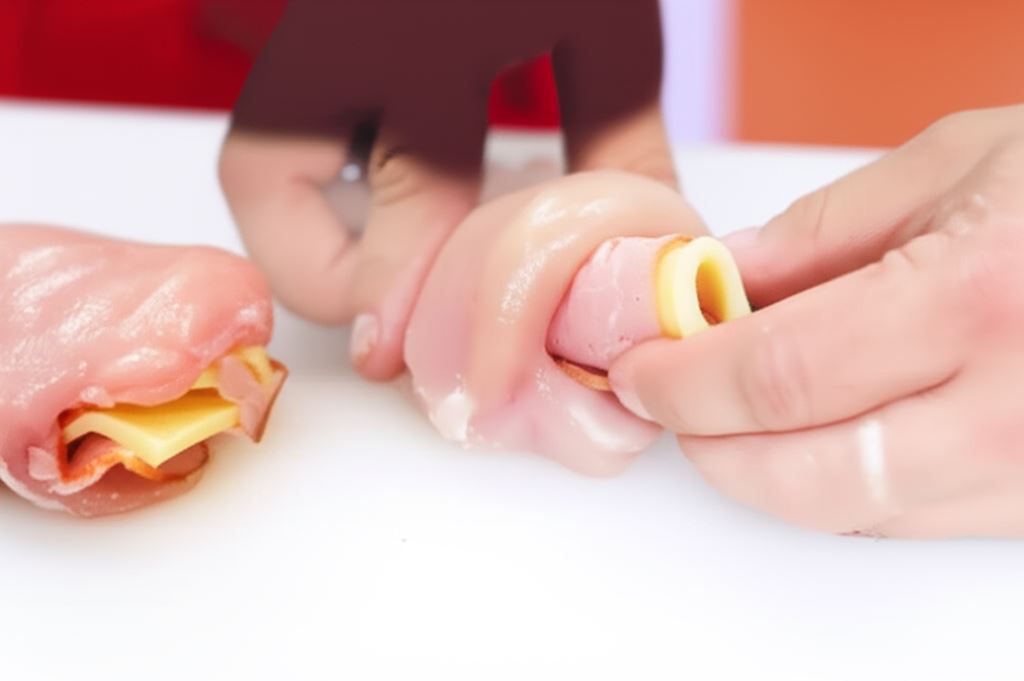 Umieść plaster sera na plastrze szynki, złóż na połowę i wprowadź całość do kieszonki.