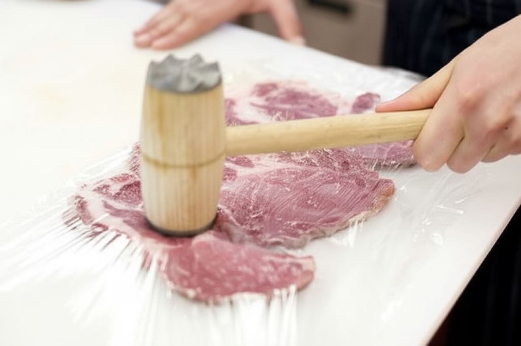 Karkówkę potnij na plastry i ubij tłuczkiem, by mięso stało się bardziej miękkie.