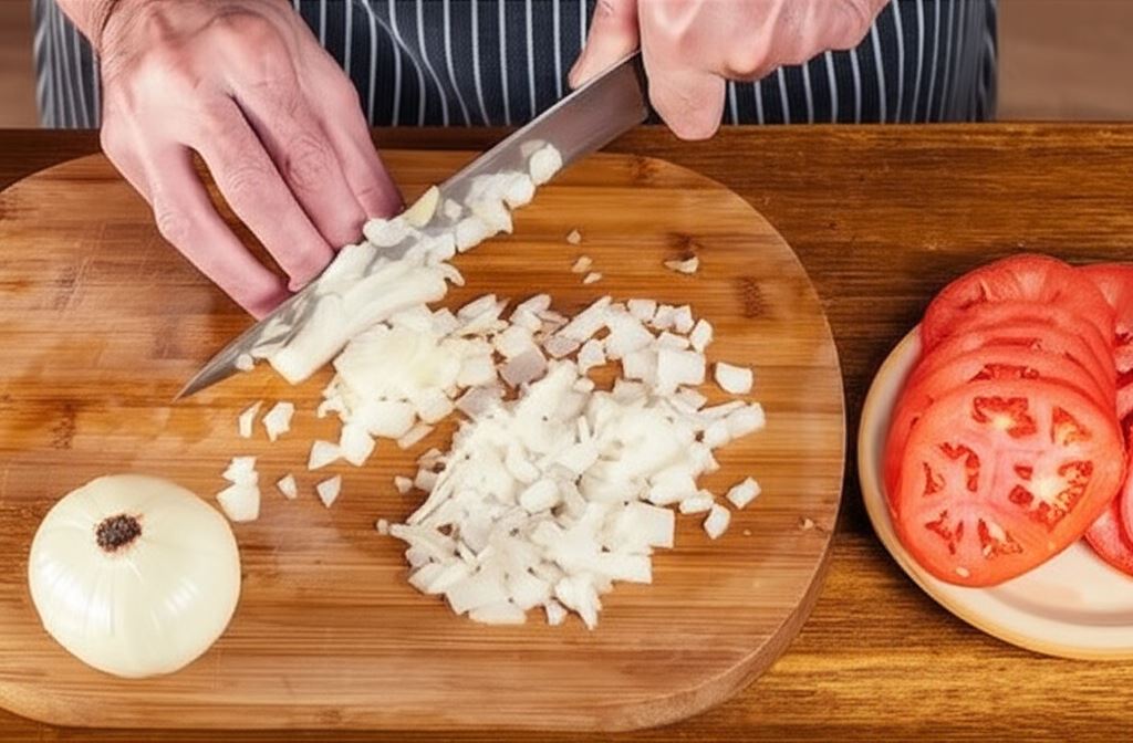 Pomidory pokrój na plastry. Cebulę posiekaj drobno.