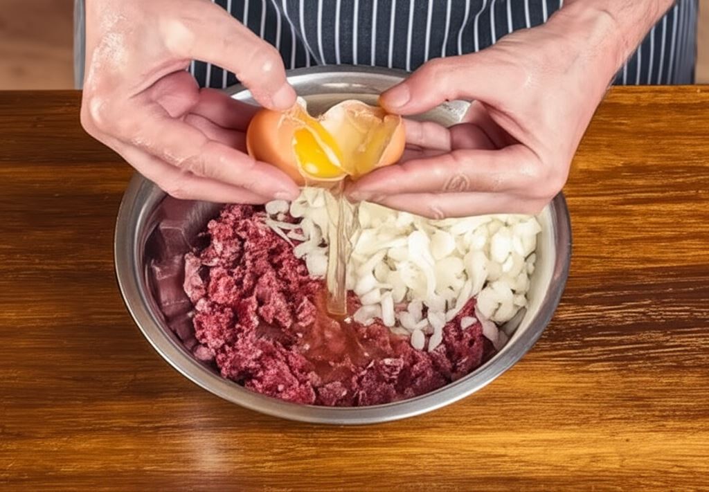 Mięso połącz z jajem i jedną posiekaną cebulką. Przypraw.