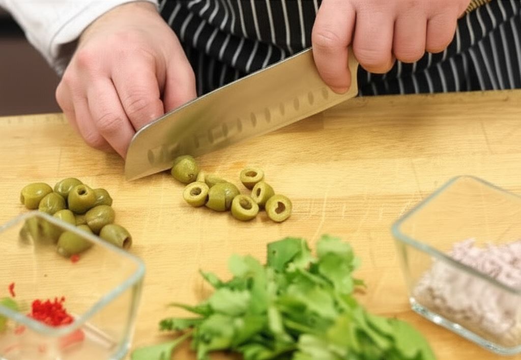 Cebule i chilli posiekaj na drobną kosteczkę. Kolendrę poszatkuj, a oliwki przetnij na połówki.