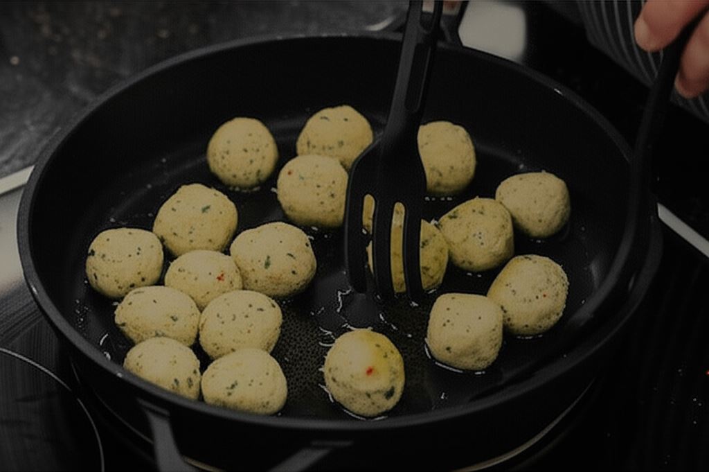 Wszystko dokładnie wymieszaj. Uformuj z masy kulki o średnicy 2-3 cm. Obsmaż je na rozgrzanej oliwie na patelni.