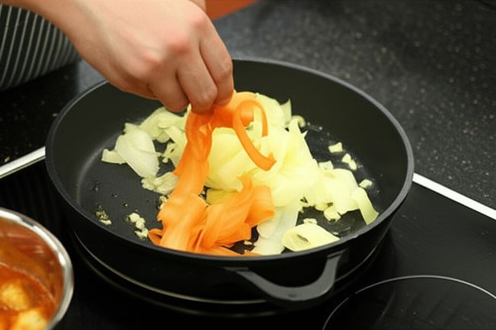 Na tej samej patelni podgrzej łyżkę oliwy, wsyp do niej posiekany czosnek, podsmaż moment, po czym dodaj przygotowane plastry warzyw, obsmaż je krótko, aby się rozgrzały. Makaron warzywny wyłóż na talerz i połącz z porcją sosu zawierającego klopsiki.