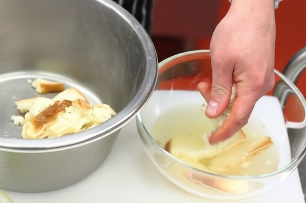 Namocz bułkę w wodzie i pozostaw na kilka minut. Kiedy zmięknie, wyciśnij wodę i rozdrobnij bułkę na małe kawałki.